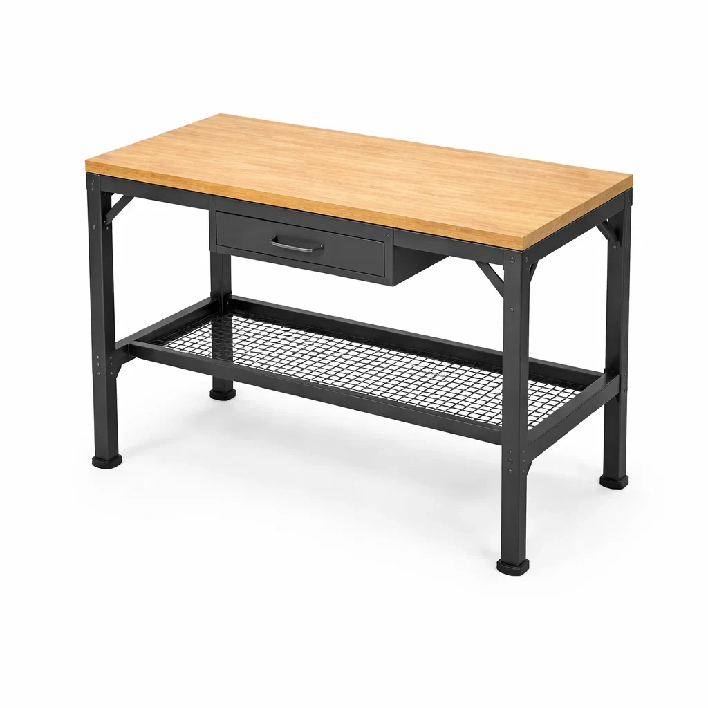 Banco da lavoro in acciaio e legno di rovere con cassetto nero