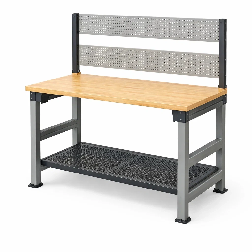 Materiale: Piano in legno di bambù, struttura in acciaio, pannello forato in acciaio.