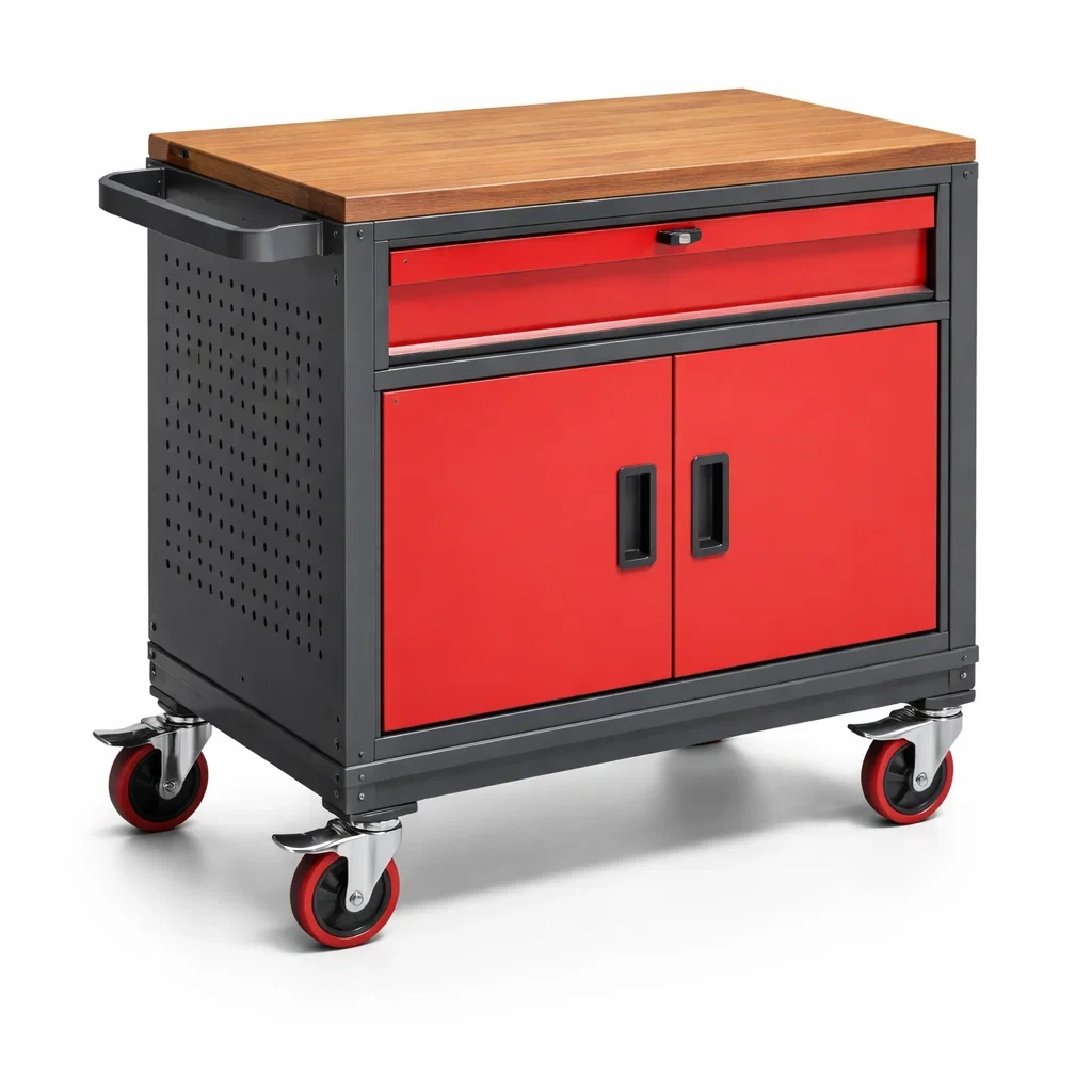 Carrello portautensili in metallo con piano in legno e vano a due ante