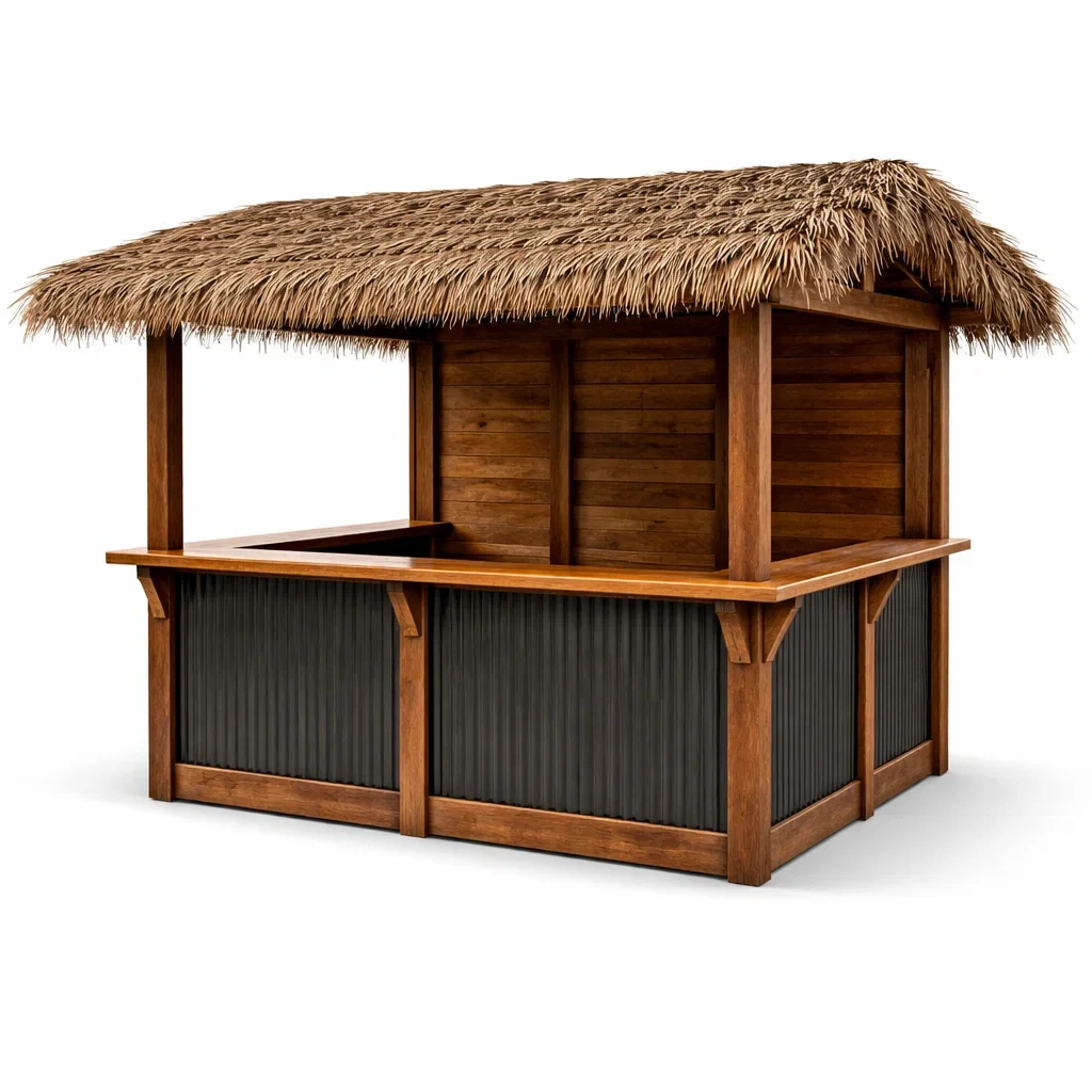 Chiosco bar con struttura in legno massello e tetto in paglia naturale. I pannelli laterali sono realizzati in metallo ondulato.