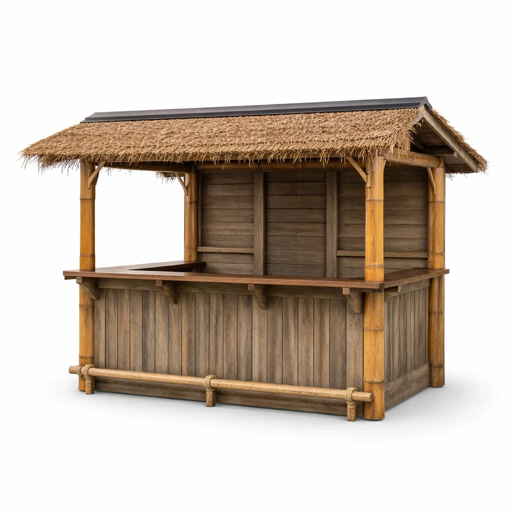 Materiale della Struttura Principale: Legno massello e bambù con tetto in paglia naturale.